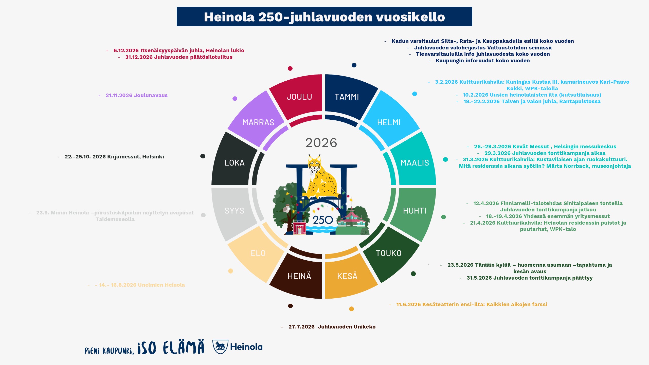 Kun on aihetta juhlaan, silloin juhlitaan. Kuulostaa yksinkertaiselta, mutta unohtuu liian helposti eteenpäin paahdettaessa. Rakkaalle 250-vuotiaalle Heinolallemme syitä juhlaan on ennättänyt kertyä rutkasti. Juhlavuonna haluammekin keskittyä täällä kasvavaan hyvään: kaupunkimme vain paranee vanhetessaan kuin Rantapuiston poppeli. Siksi kutsumme kaikki juhlimaan yhteistä Heinolaamme – tulkaahan tekin!