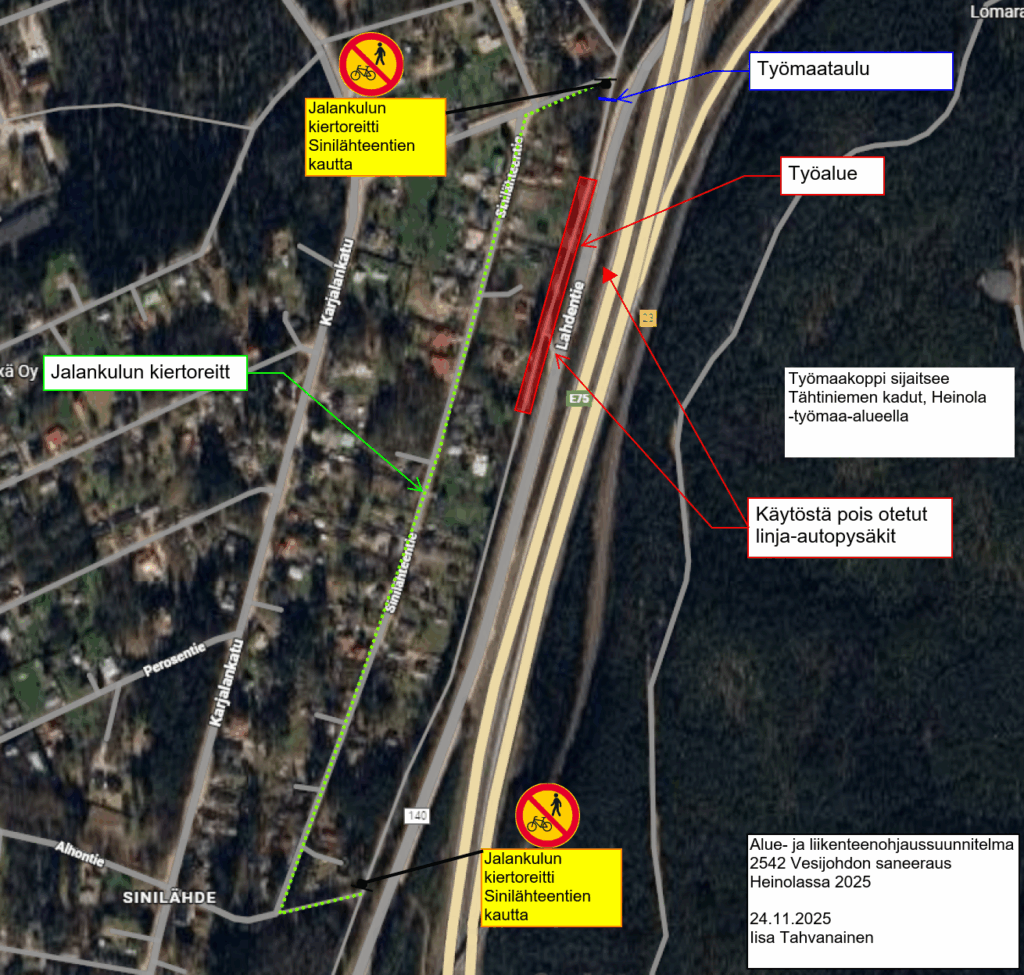 Sinilähteen alueella tehdään saneeraustöitä keskiviikosta 26.11.2025 alkaen. Huomioithan jalankulun kiertoreitit ja käytöstä poistetut linja-autopysäkit. Alla alue- ja liikenteenohjaussuunnitelma muutoksista.