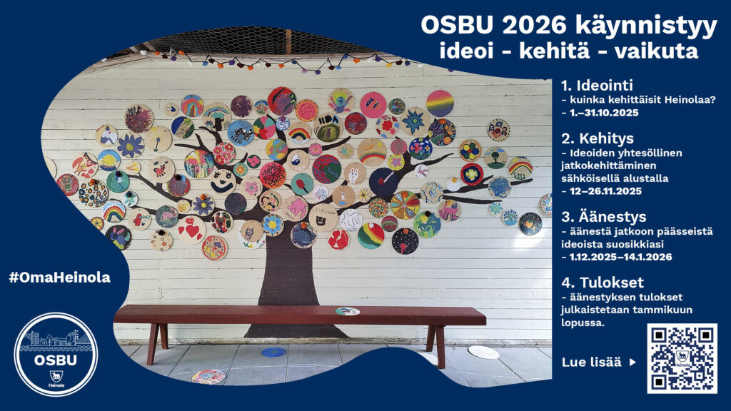 Osallistuvan budjetoinnin vuoden 2026 ideointivaihe on käynnissä. Ehdit jättää ideasi joko perinteisellä paperilomakkeella Heinolan kaupungin asiakaspalvelupisteellä, kirjastossa, uimahallissa tai sähköisesti.