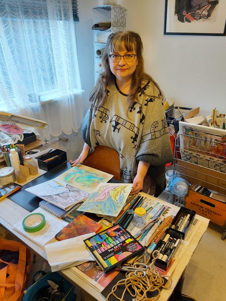 Sitten on ollut tällainen, että joku opettaja sanoi, että sininen ja vihreä ei sovi yhteen. Ne vähän taistelee keskenään, että niitä ei kannata maalauksessa sillä tavalla käyttää. Mä jäin miettimään sitä pitkän aikaa, että miten niin? Luonto on täynnä sinistä ja vihreetä. En yhtään tajunnut, mitä se sillä tarkoitti. Mutta just tällaisista, kun tuossa ei tarvi jäädä takertumaan niihin.