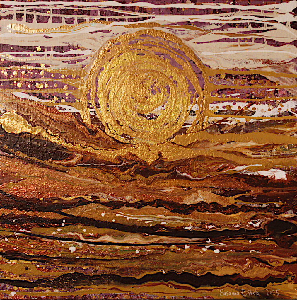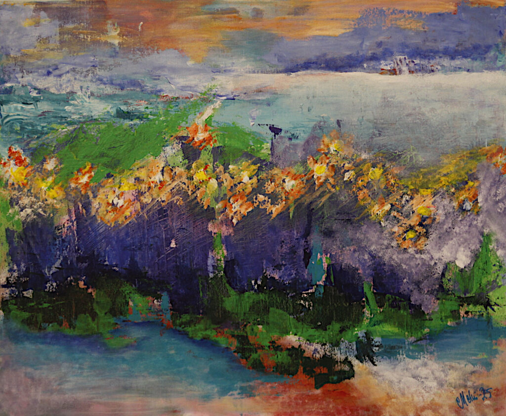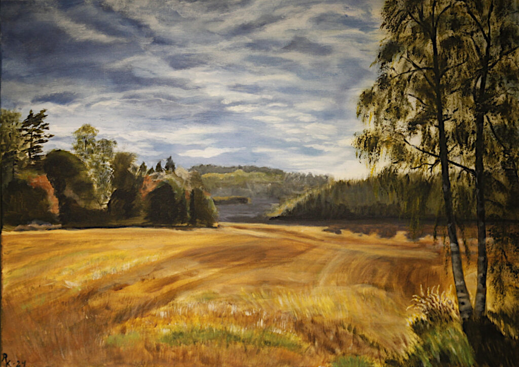 Kolme teosesimerkkiä vuoden 2025 juhlanäyttelystä. Vasemmalta Mervi Ahosen, Ritva Kivisen ja Susanna Eskolan maalaukset. Kuvat: Kari Utti