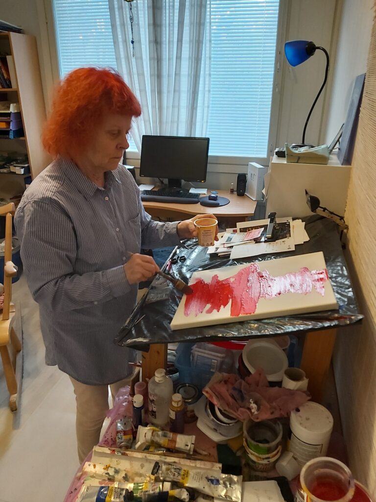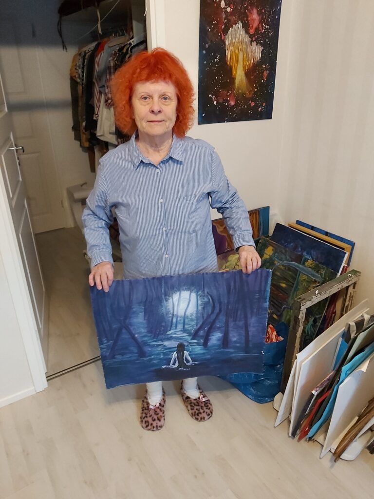 Irene Voutilainen työhuoneessaan ja valmiin maalauksen kanssa.
