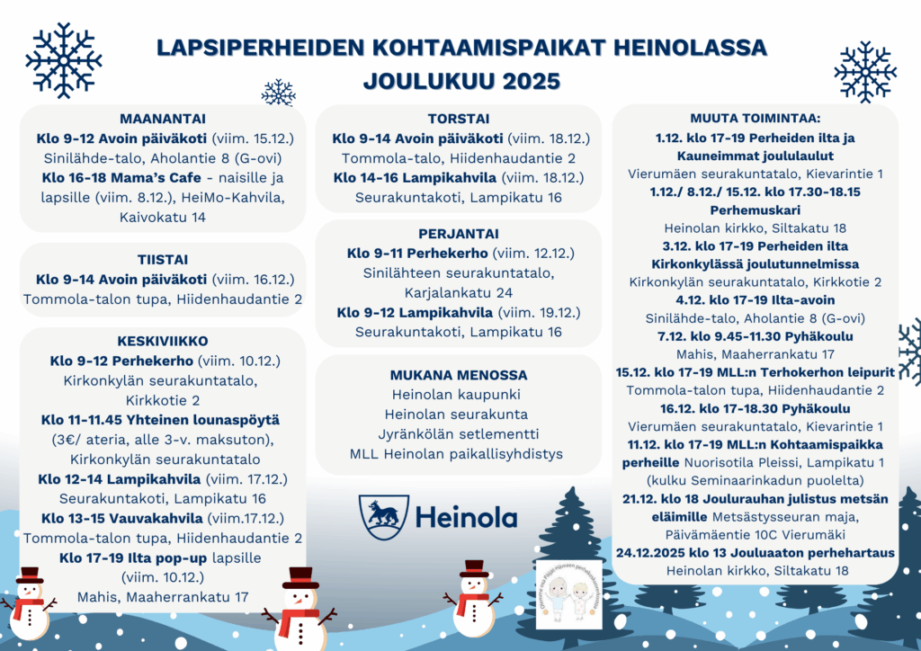 Heinolan perhekeskusverkosto tarjoaa monipuolisen kattauksen kohtaamispaikkoja lapsiperheille. Perhekeskusverkostoon kuuluvat lasten, nuorten ja perheiden hyvinvointia ja terveyttä edistävät sekä varhaista tukea, hoitoa ja kuntoutusta tarjoavat hyvinvointialueen (mm. neuvola, opiskeluhuolto), kunnan (mm. varhaiskasvatus, koulu, nuoriso- ja liikuntapalvelut) sekä kolmannen sektorin (mm. seurakunnat, seurat, järjestöt) palvelut.
