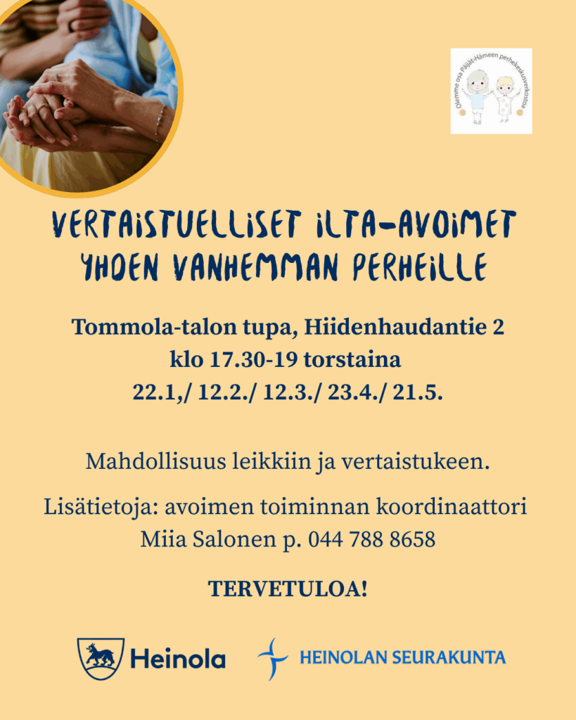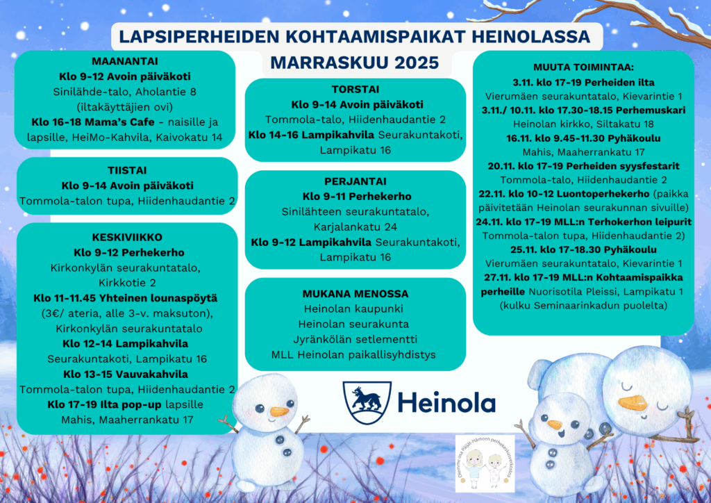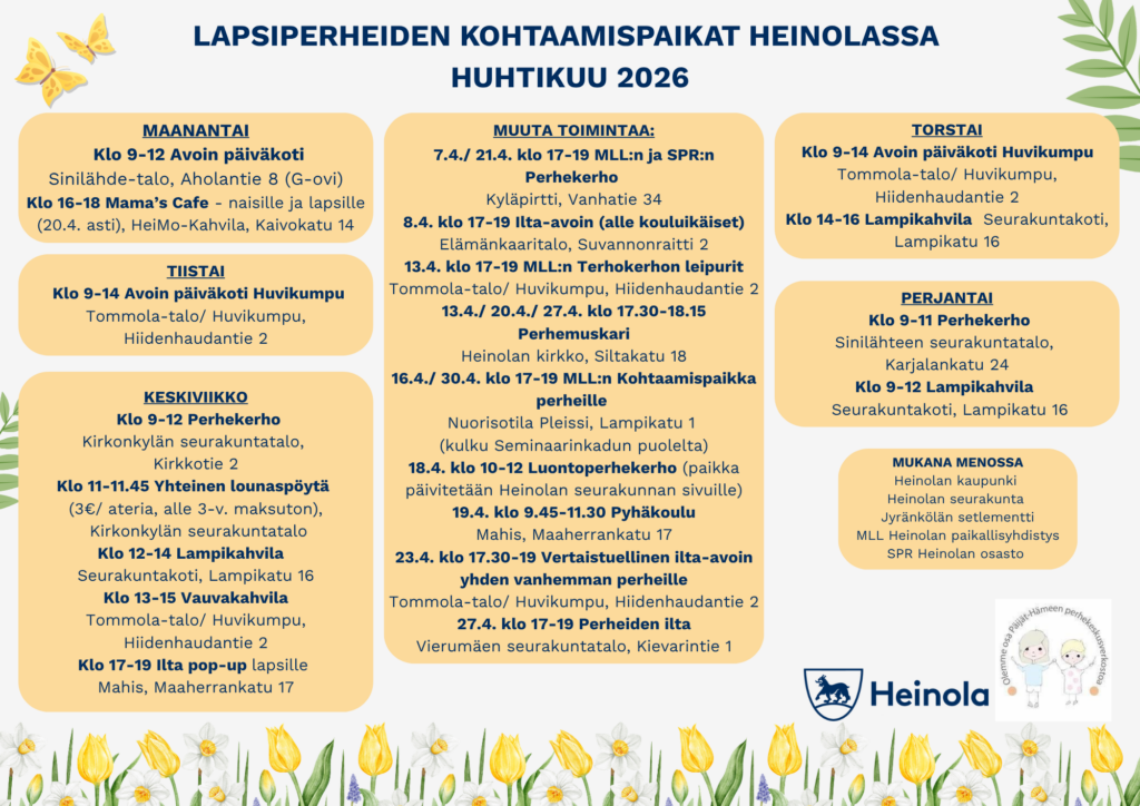 Heinolan perhekeskusverkosto tarjoaa monipuolisen kattauksen kohtaamispaikkoja lapsiperheille. Perhekeskusverkostoon kuuluvat lasten, nuorten ja perheiden hyvinvointia ja terveyttä edistävät sekä varhaista tukea, hoitoa ja kuntoutusta tarjoavat hyvinvointialueen (mm. neuvola, opiskeluhuolto), kunnan (mm. varhaiskasvatus, koulu, nuoriso- ja liikuntapalvelut) sekä kolmannen sektorin (mm. seurakunnat, seurat, järjestöt) palvelut.