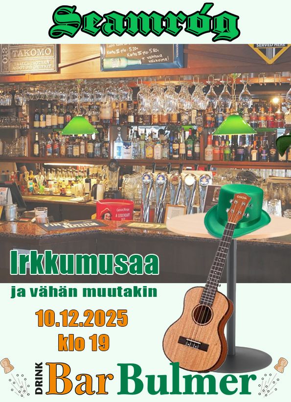 Kuuletko jo tinapillin kutsun? Heinolan kansalaisopiston kurssilaisten irkkumusaa henkivä Seamróck-yhtye juhlistaa syyskauden päättymistä keikalla Bar Bulmerissa ke 10.12.klo 19 alkaen. Vapaa pääsy, tervetuloa polkemaan jalalla tahtia!