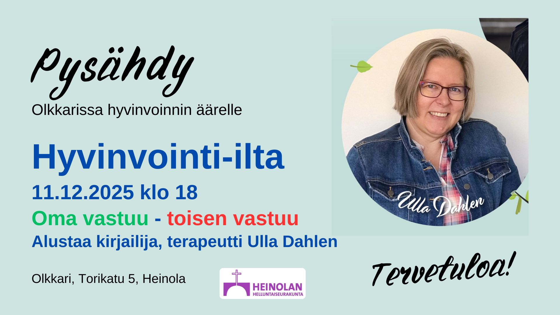 Kirjailija, terapeutti, Ulla Dahlen alustaa, ja johtaa keskustelua, aiheesta ”Oma vastuu – toisen vastuu”. Tarjolla iltateetä. Tervetuloa mukaan!
