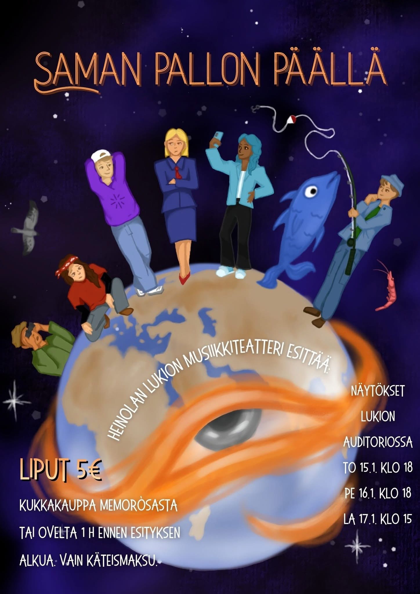 Heinolan lukion perinteikkään musiikkiprojektit saavat tällä viikolla jatkoa, kun lukion musiikkiteatteri esittää näytelmän Saman pallon päällä. Työryhmän yhteisten pohdintojen pohjalta syntynyt näytelmä sukeltaa ilmastokriisin maailmaan – siihen, miltä se tuntuu, miten se näkyy ja mitä se meissä herättää. Tarina kulkee eri näkökulmien ja kokemusten kautta, risteilee yksilön, yhteisön ja koko planeetan välillä. Miten toimia niin, että toimisi oikein? Onko meillä vielä toivoa? Näytelmä ei tarjoa valmiita vastauksia, vaan kutsuu katsojan mukaan etsimään niitä. Tapahtumia syventävät livebändin ja kuoron esittämät tutut musiikkikappaleet.