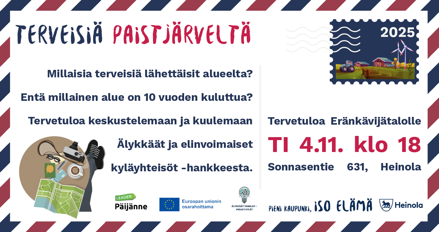 Lämpimästi tervetuloa keskustelemaan ja kehittämään asuinaluetta Eränkävijätalolle (Sonnasentie 631) tiistaina 4.11. klo 18 alkaen. Tilaisuudessa kuullaan myös Älykkäät ja elinvoimaiset kyläyhteisöt -valmisteluhankkeesta, jonka tarkoituksena on vahvistaa Heinolan kylien osallisuutta ja yhteisöllisyyttä sekä pito-, veto- ja lumovoimaa kylätoimintaa yhteiskehittämällä.