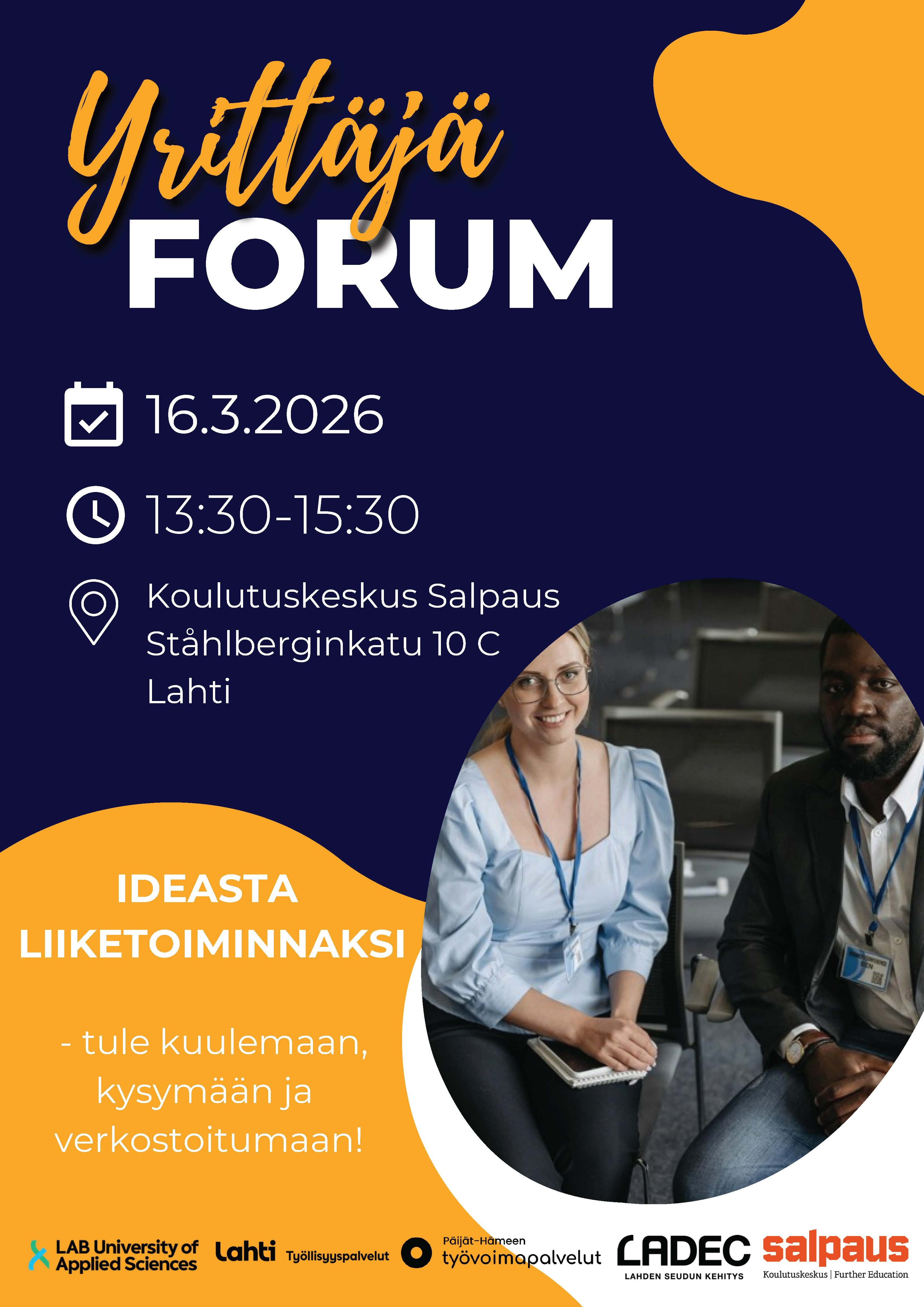 Kiinnostaako yrittäjyys tai oletko aloittanut hiljattain yritystoiminnan? Entä oletko tehnyt liiketoimintasuunnitelman ja kaipaat seuraavia käytännön askelia? Myös omistajanvaihdos – yrityksen ostaminen tai myyminen – voi olla vaihtoehto yrittäjäksi ryhtymiseen. Tervetuloa yrittäjyystapahtumaan kuulemaan lyhyitä ja käytännönläheisiä tietoiskuja yrittäjän palveluista sekä inspiroivia yrittäjien puheenvuoroja. Yrittäjäpuheenvuorot: Päivi Niemiaho, Bistro Tango & Matto Drilon Shala, Shala & Saqi Parturi Oy Tapahtumassa on myös verkostoitumisosuus, jossa pääset tutustumaan muihin yrittäjyydestä kiinnostuneisiin sekä alueen toimijoihin. Näytteilleasettajat: Lisäksi paikalla on näytteilleasettajia, joilta saat käytännön apua ja kontakteja mm. rahoitukseen, taloushallintoon, markkinointiin ja henkilöstöratkaisuihin. Tapahtumassa mukana: Koulutuskeskus Salpaus LAB University of Applied Science Ladec Lahden työllisyyspalvelut Päijät-Hämeen työvoimapalvelut Finnvera OP Häme Päijät-Hämeen yrittäjät Eezy henkilöstöpalvelut Dooroom Mivicom Montiary Ukko.fi SOLA Startup refugees Ei ennakkoilmoittautumista – tule paikalle!